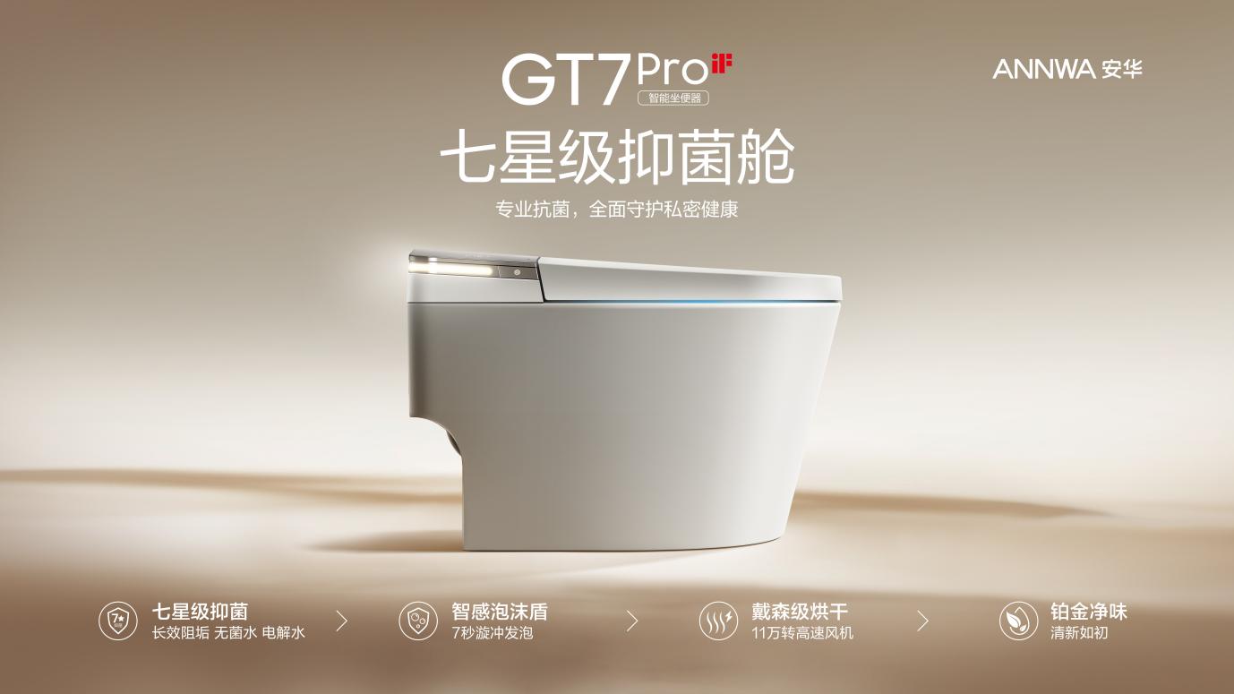 产品为先,创新驱动 践行健康人居新范式 自品牌创立以来,安华卫浴始终锚定“年轻态”核心定位,秉持“年轻、时尚、自由”的品牌理念深耕行业并开辟差异化路径,以 “智能科技赋能、时尚设计赋能、人性化功能赋能”为核心逻辑,构建起与新生代消费者深度对话的产品语言与情感连接。 GT7 Pro七星级抑菌智能坐便器,搭载“15重抑菌科技”,将专业级抗菌技术贯穿于从落座、清洗、冲刷到空气净化的如厕全流程,于每一处细节中,为家人提供周全的私密健康守护。